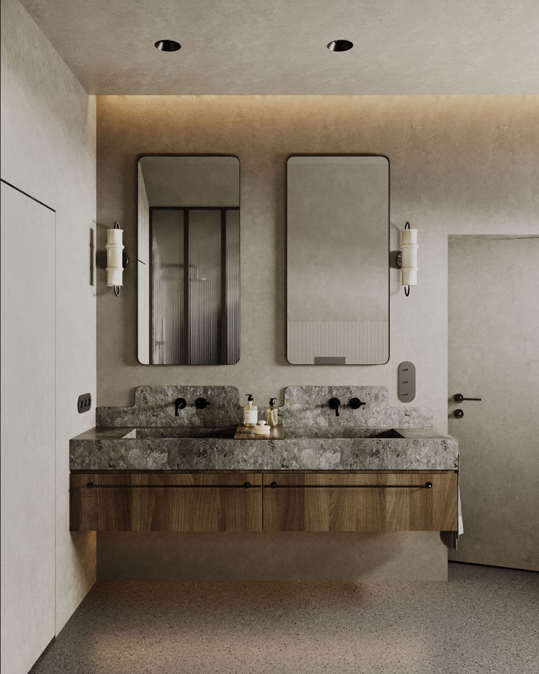 To wnętrze zostało zaprojektowane tak, aby sprzyjać wyciszeniu i odpoczynkowi. Ciepłe drewno, miękkie tekstylia i kamienne akcenty tworzą harmonijną całość, w której estetyka idzie w parze z komfortem. Naturalne materiały wprowadzają do przestrzeni równowagę i bliskość natury, a stonowana paleta barw sprawia, że każdy element działa kojąco na zmysły. To przestrzeń, która otula spokojem i pozwala w pełni się zrelaksować.